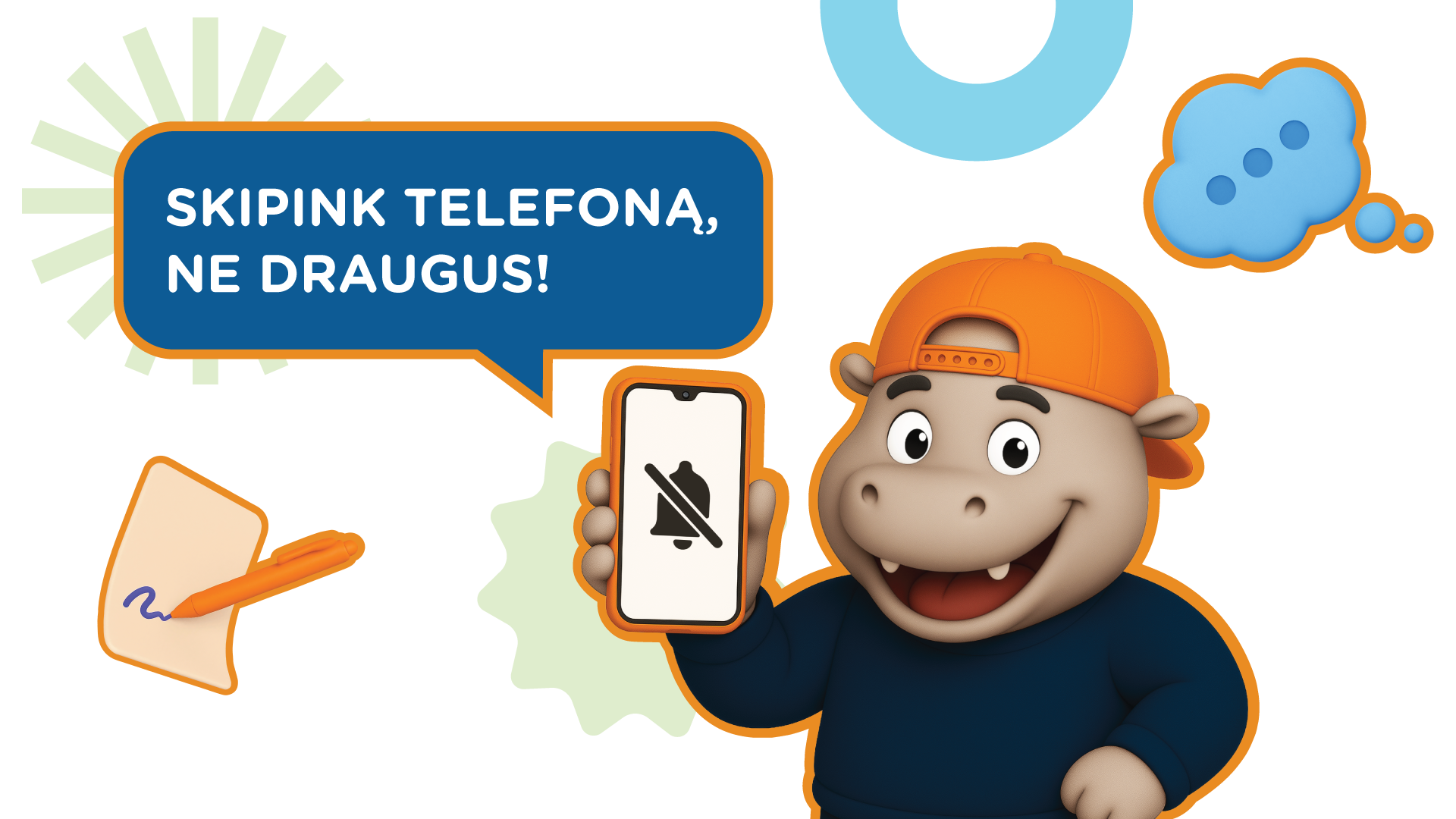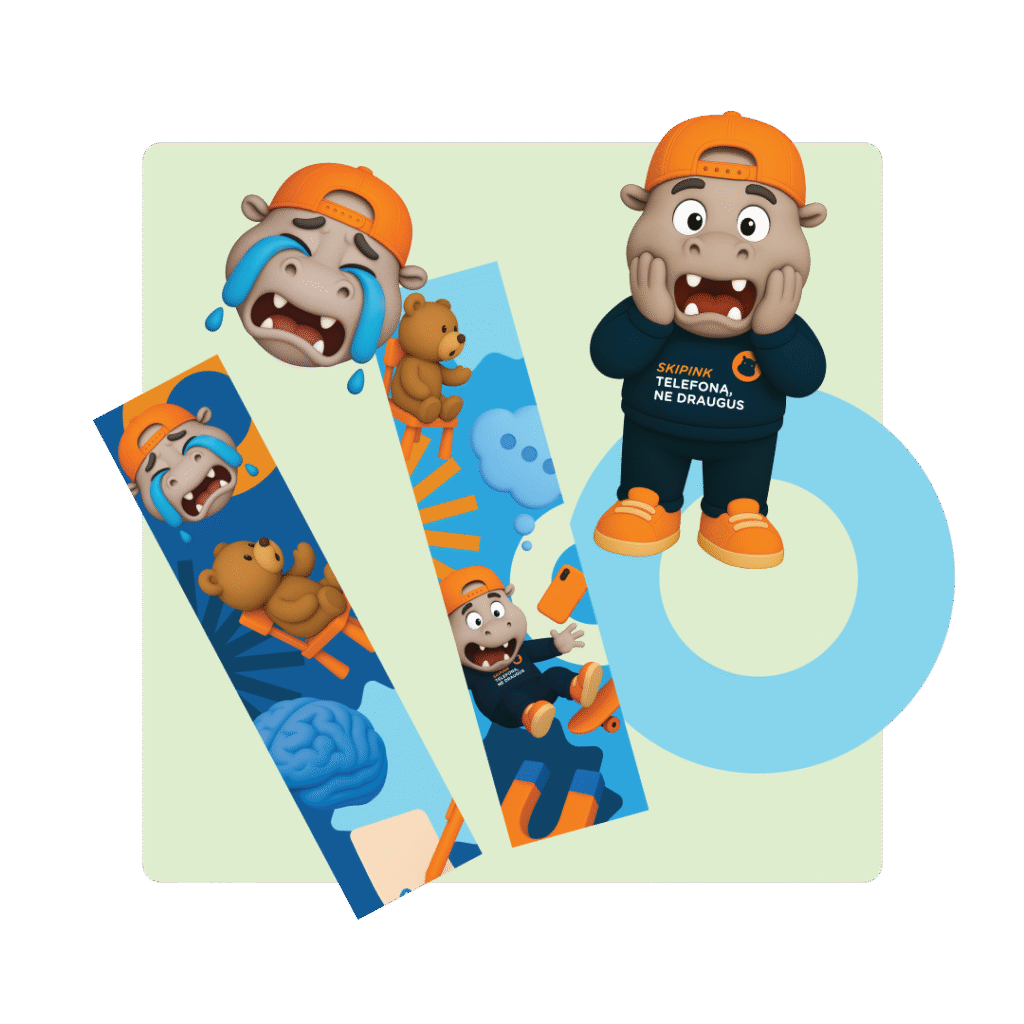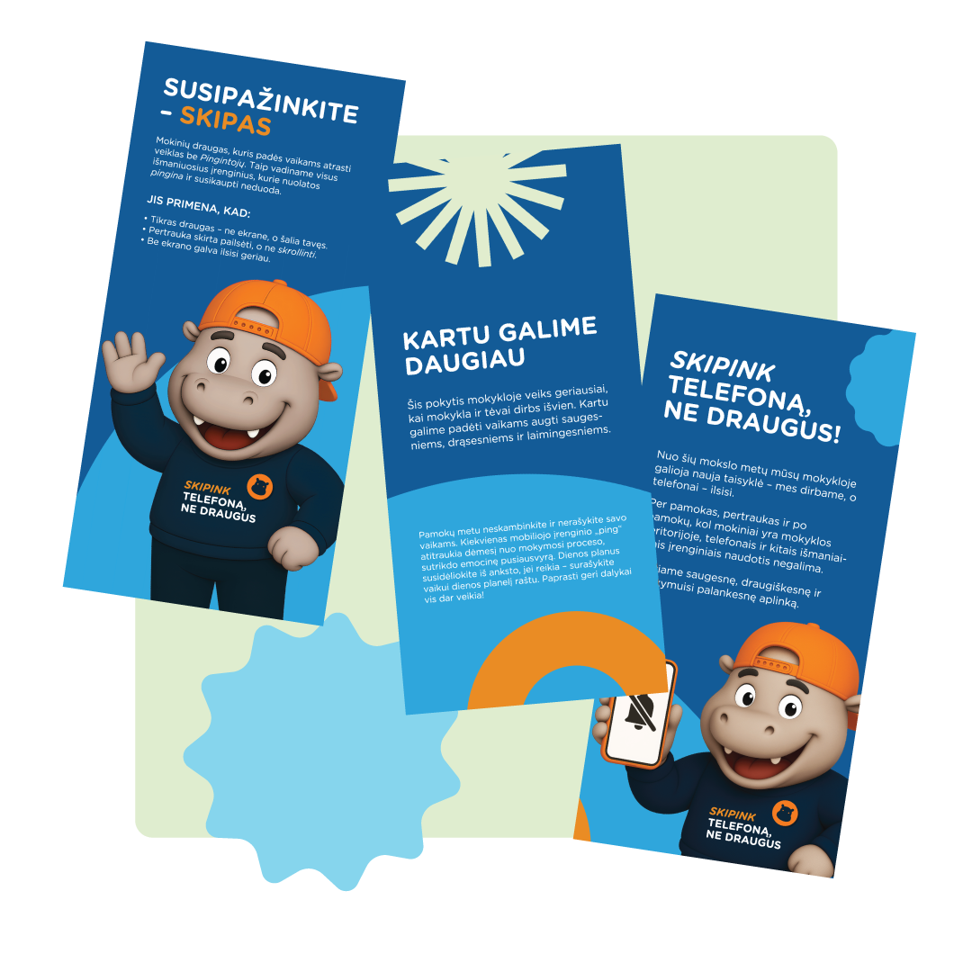Skipo lipdukai motyvuos vaikus ir draugiškai primins telefono taisykles. Juos galima dalinti per pamokas ar pertraukas kaip paskatinimą įsitraukti į mokyklos veiklas, o knygų skirtukas – mažas praktiškas kasdienis daiktas.