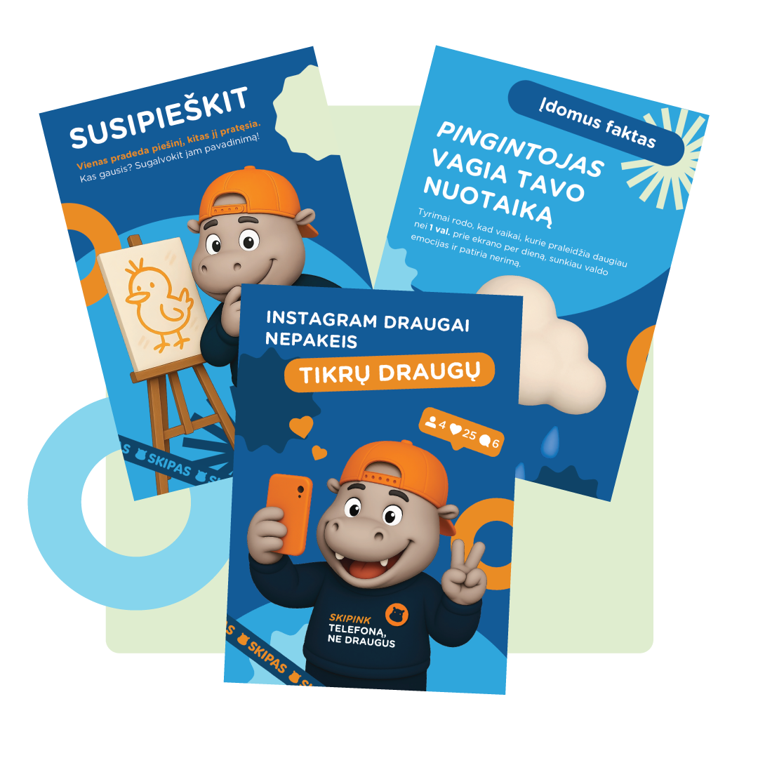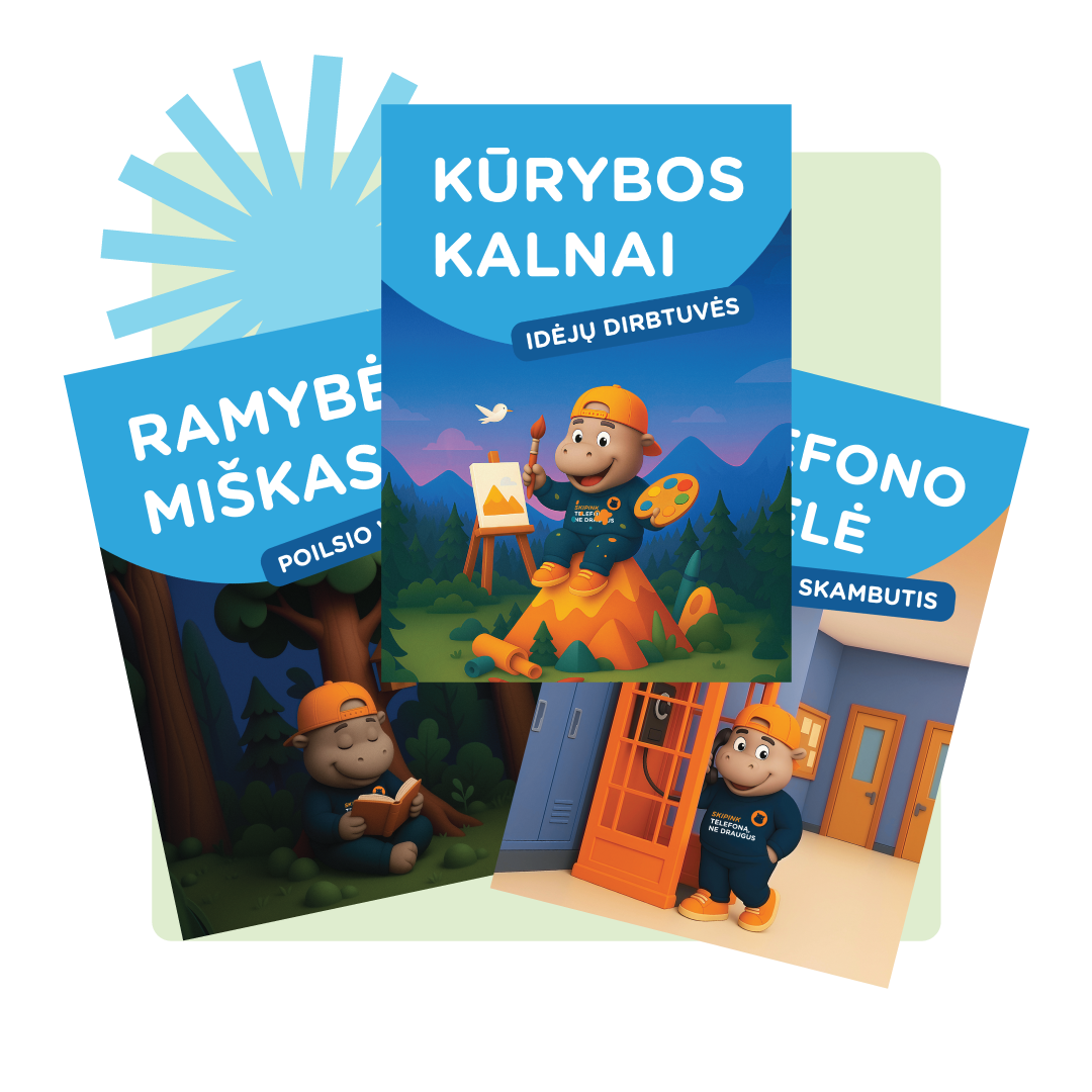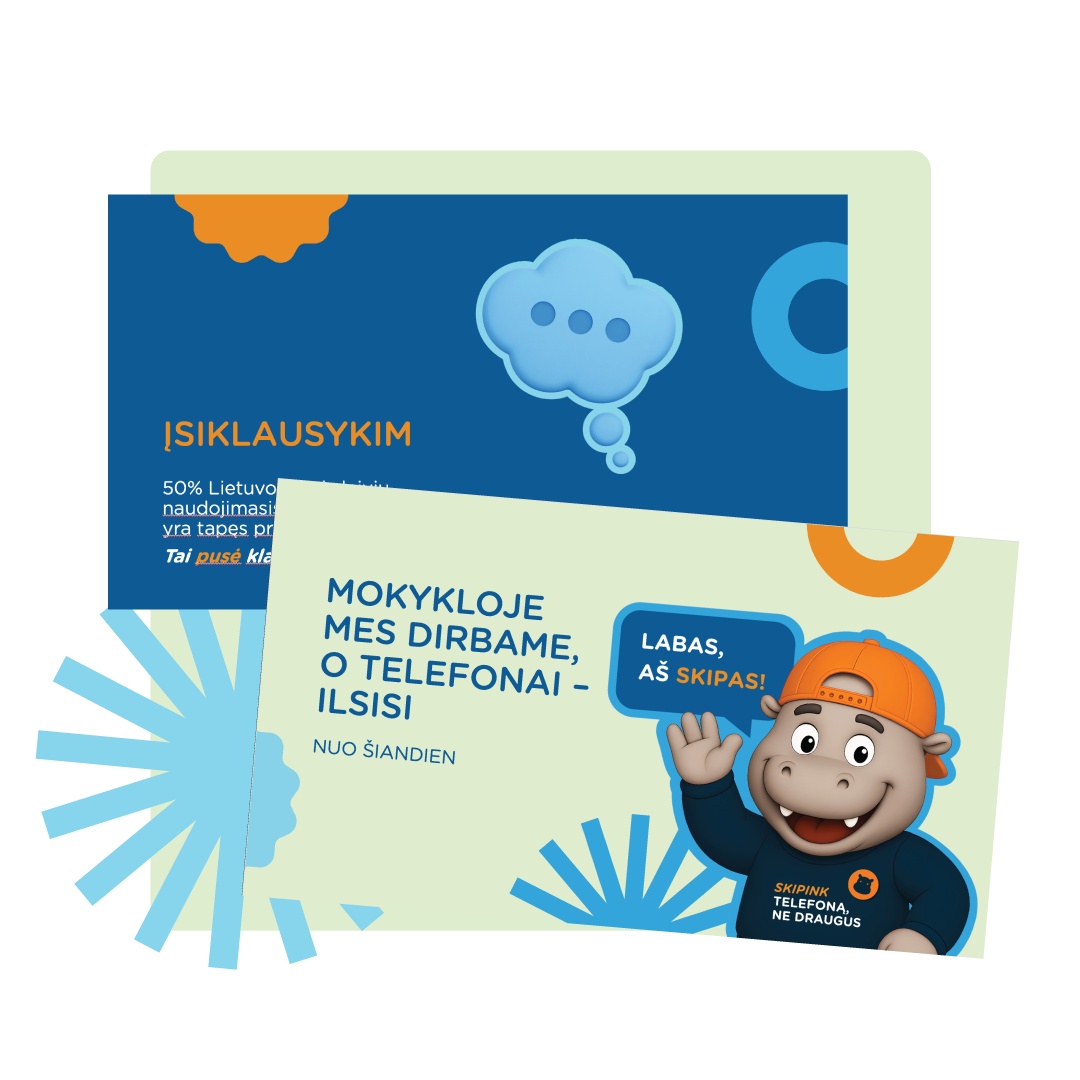 Skipo plakatai su patarimais ką veikti per pertrauką be ekranų, lipdukai, vadovėlių ir knygų skirtukai ir kitos ryškios, nuotaikingos priemonės draugiškai primins apie naują taisyklę mokykloje ir padės jos laikytis.